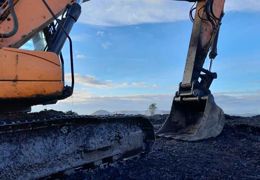 Těžká technika na místě rozhrabává hromadu štěpky, aby se hasiči dostali k místům, kde přetrvává vysoká teplota. Rozhrabané části jsou následně důkladně prolévány vodními proudy. Cílem je ochladit celý objem materiálu a předejít opětovnému vzplanutí.