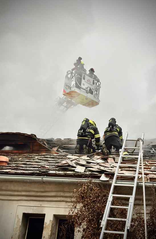 Součástí zásahu byly také práce na konstrukci střechy. "Z automobilového žebříku částečně rozebíráme střechu a objekt odvětráváme," uvedli hasiči během zásahu.