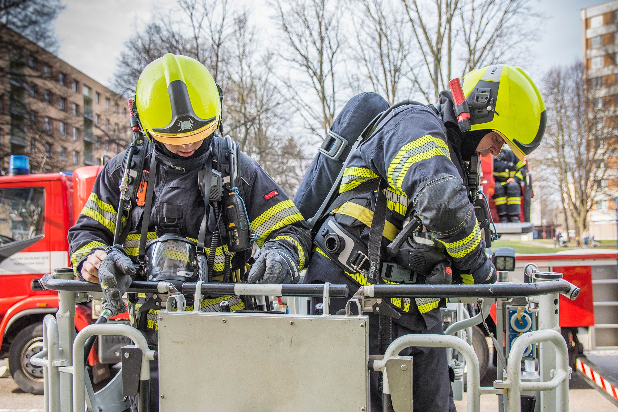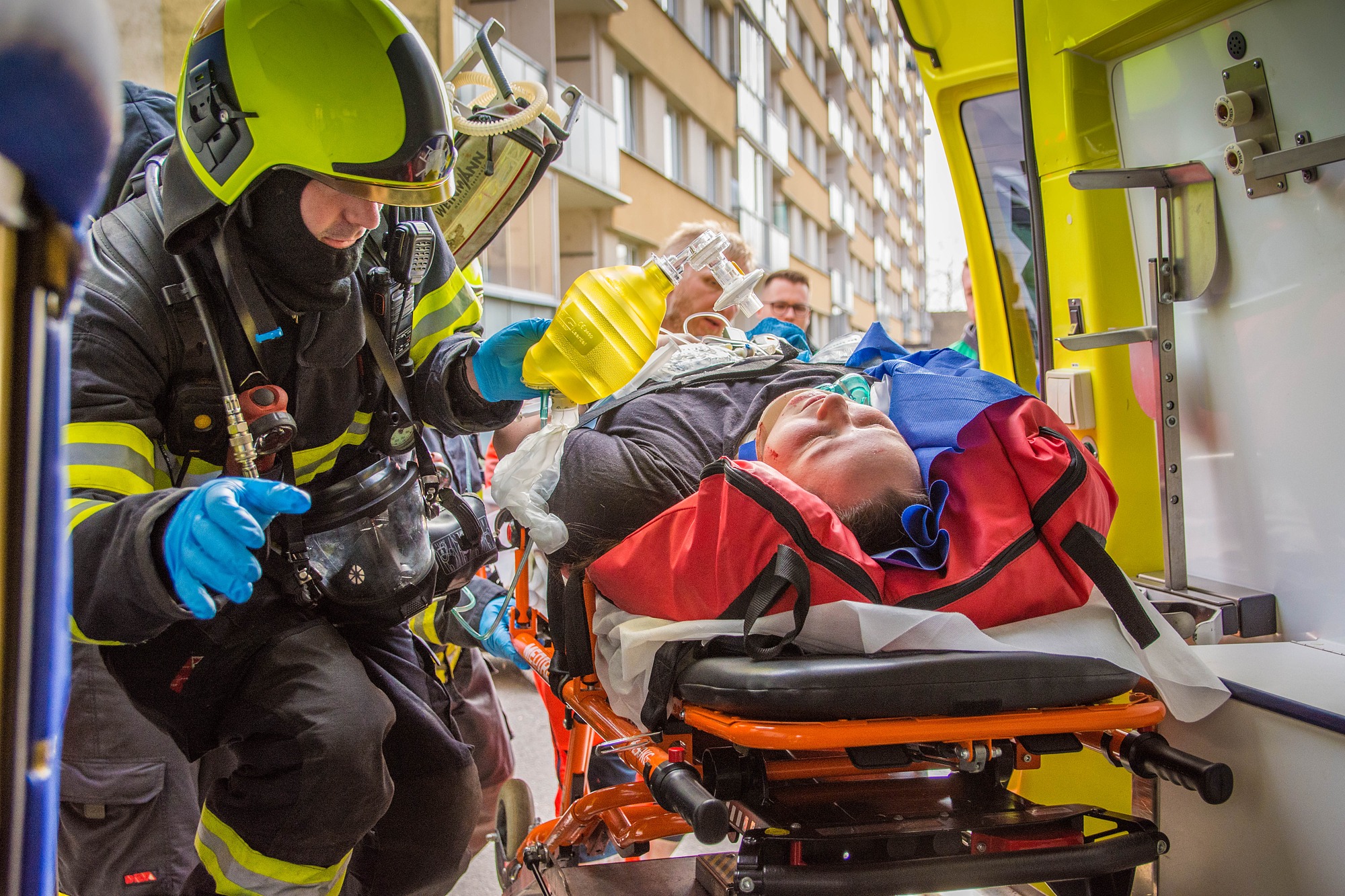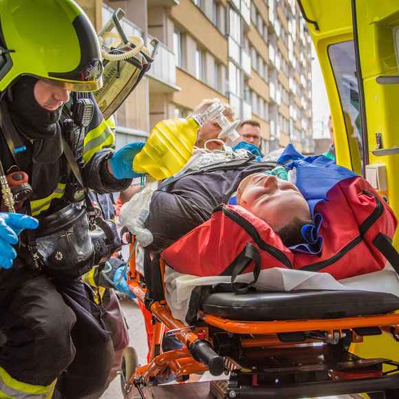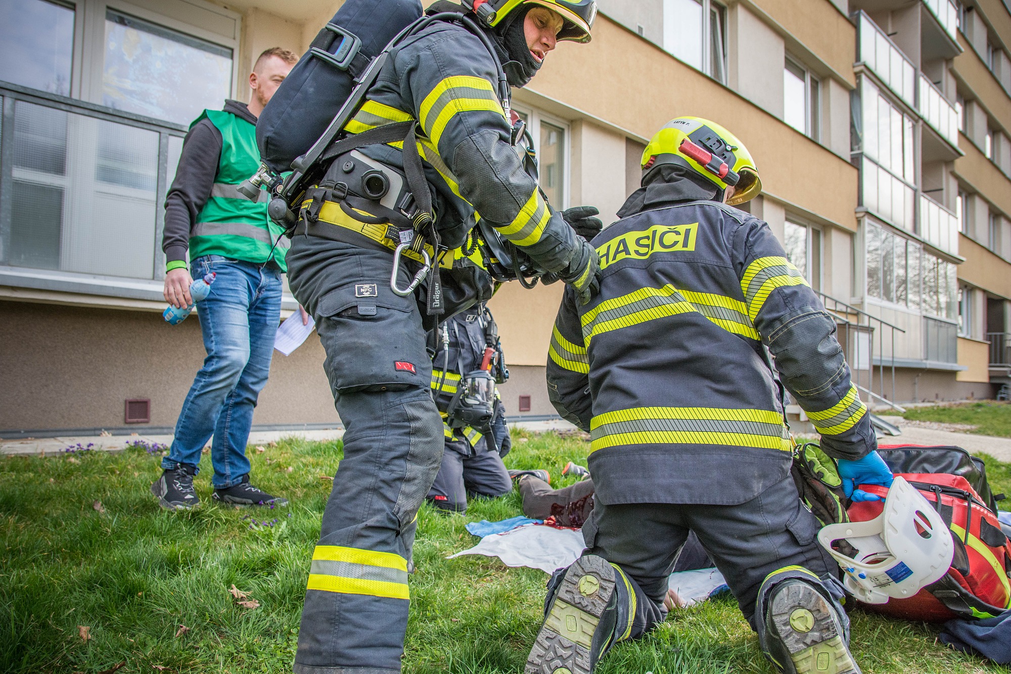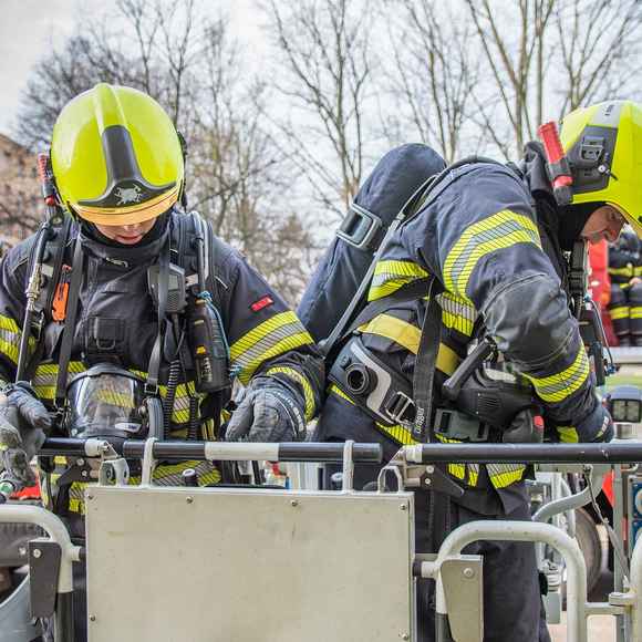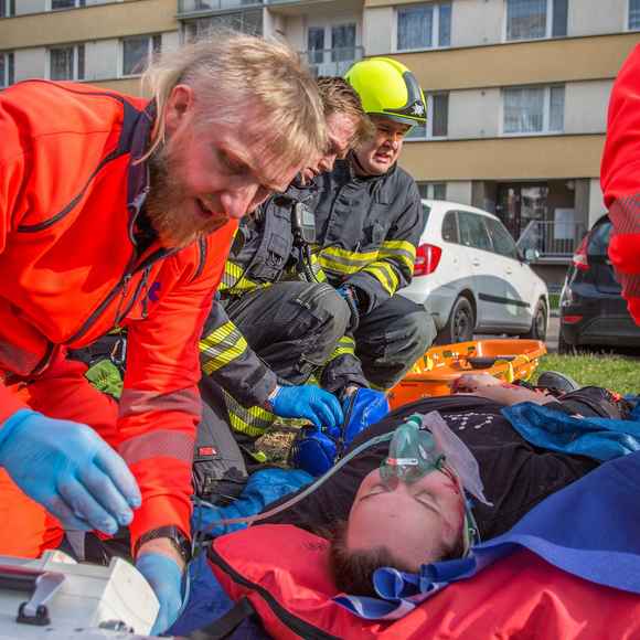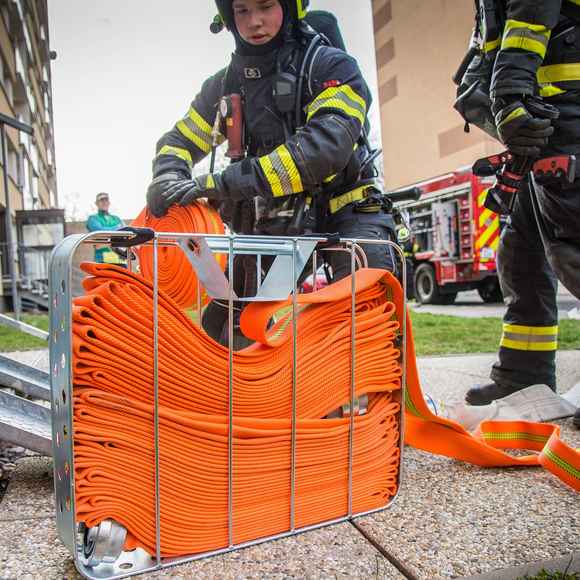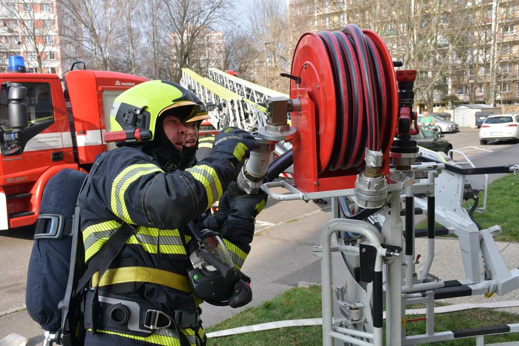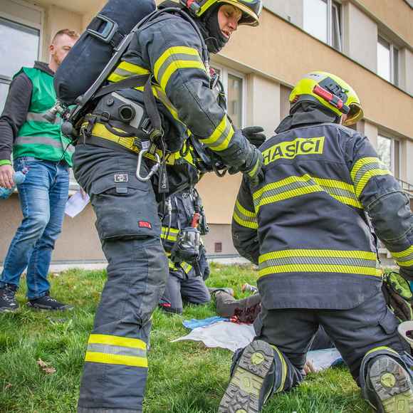 Požár v sedmém patře bytového domu a zranění obyvatelé. Hasiči nacvičovali zásah ve výškové budově