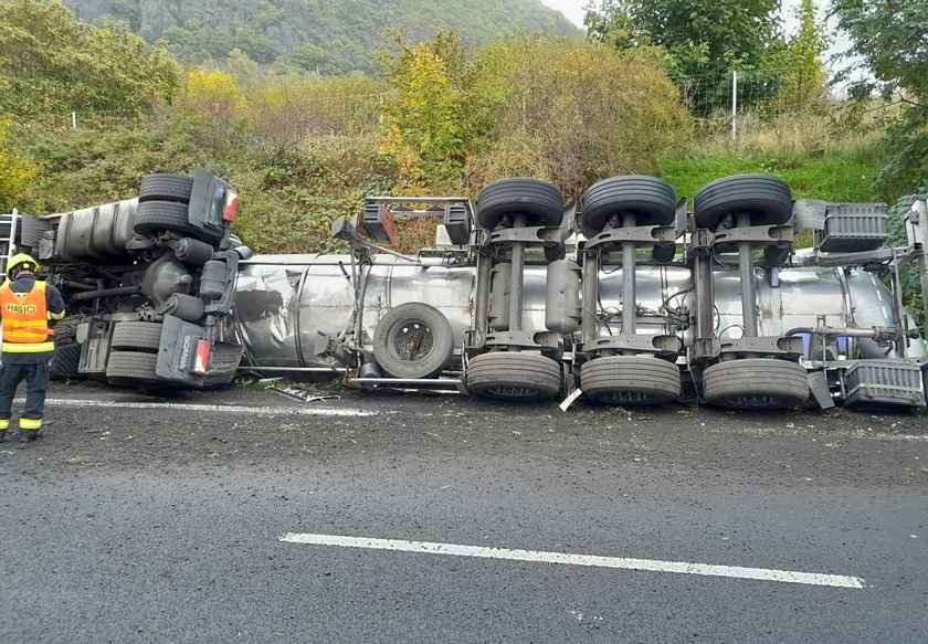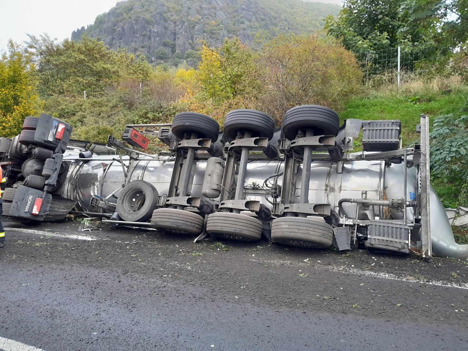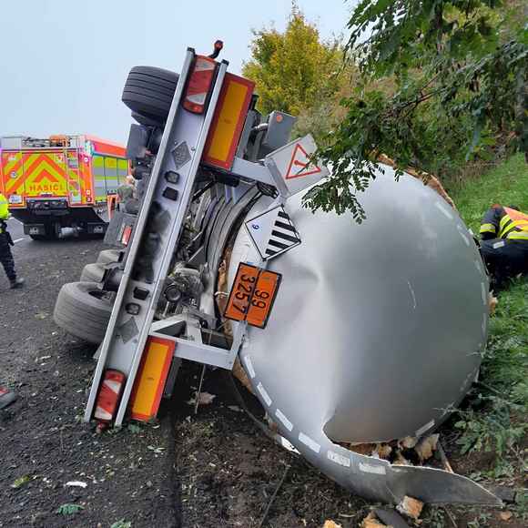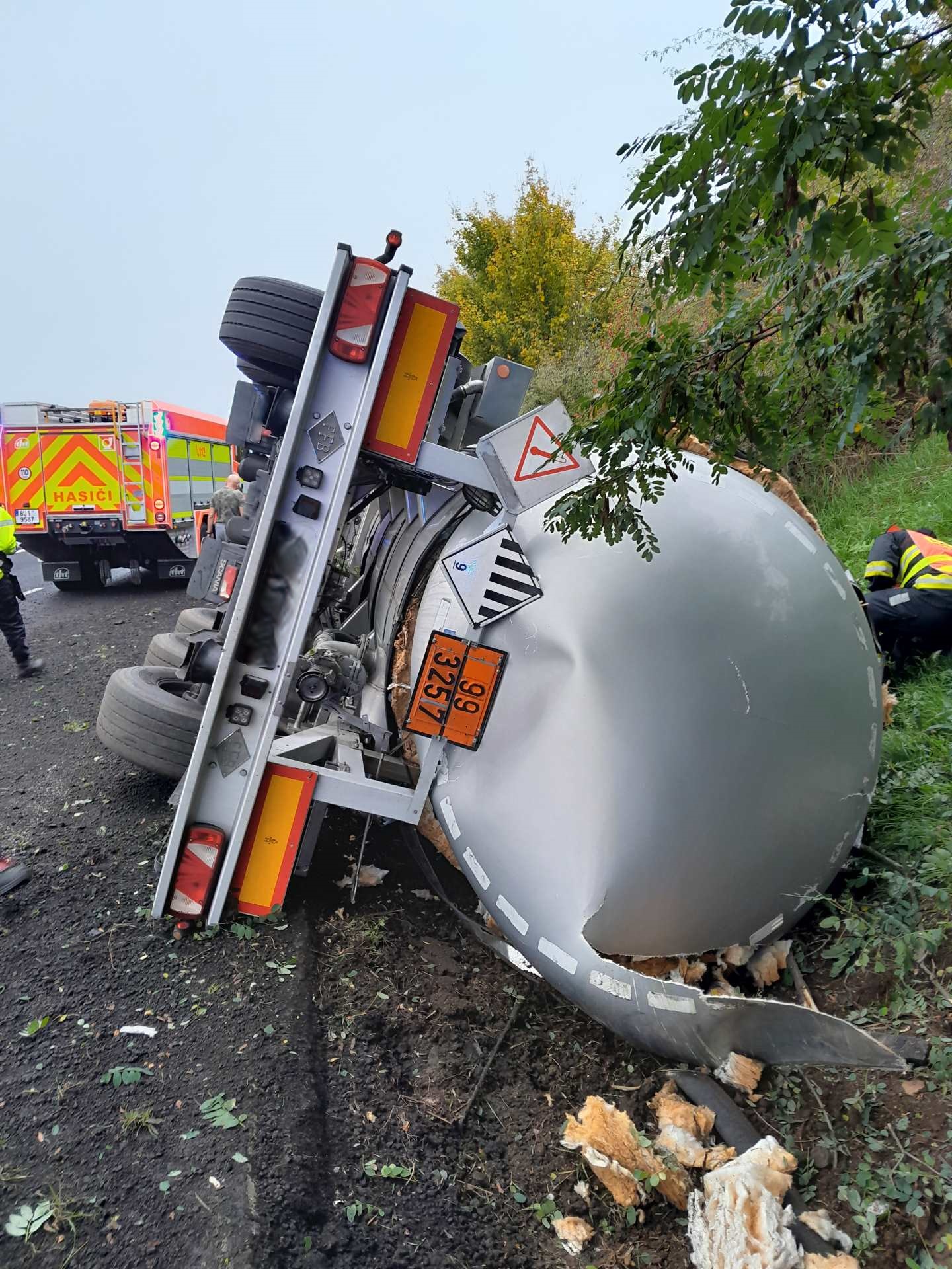 V úterý 7. října krátce před 17. hodinou přijali hasiči oznámení o převrácené cisterně, která převážela asfalt. Řidič vyvázl bez zranění, silnice musela být uzavřena v obou směrech.