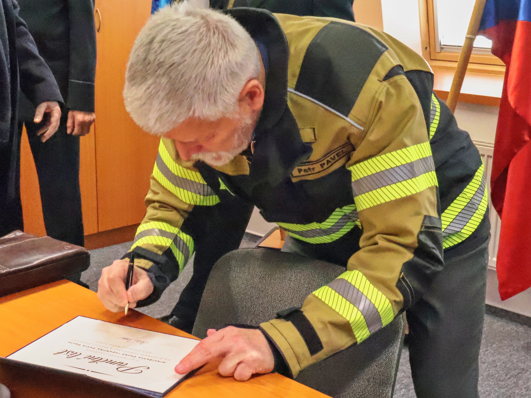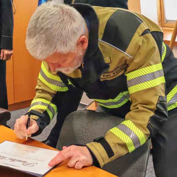 Závěr návštěvy patřil podpisu pamětního listu a předání originálního daru. Prezident obdržel zásahový hasičský oblek ušitý na míru od společnosti DEVA FM s.r.o. v netradiční barevné kombinaci, jako jedinečnou památku na setkání s olomouckými hasiči. Program uzavřelo společné focení před stanicí s výjezdovými hasiči a zásahovou technikou.