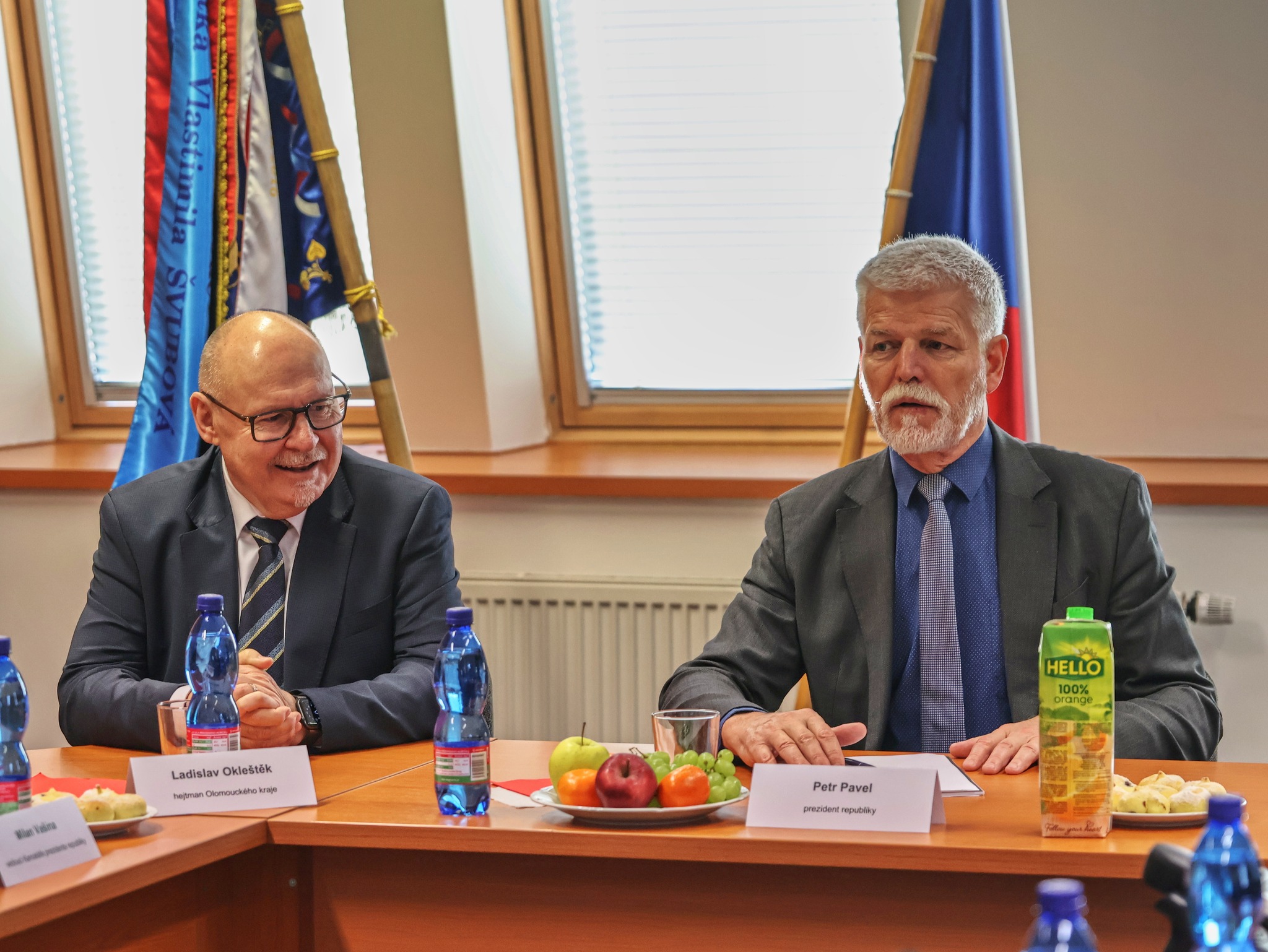 Prezidentská kolona dorazila před sídlo hasičů krátce po půl desáté. Prezidenta přivítal krajský ředitel brig. gen. Karel Kolářík, následovalo setkání s hejtmanem Olomouckého kraje Ladislav Okleštěk a vedením krajského sboru. V rámci krátké prezentace byl prezident seznámen s fungováním HZS Olomouckého kraje, připomenuty byly také nejvýznamnější zásahy posledních let.