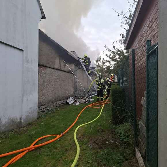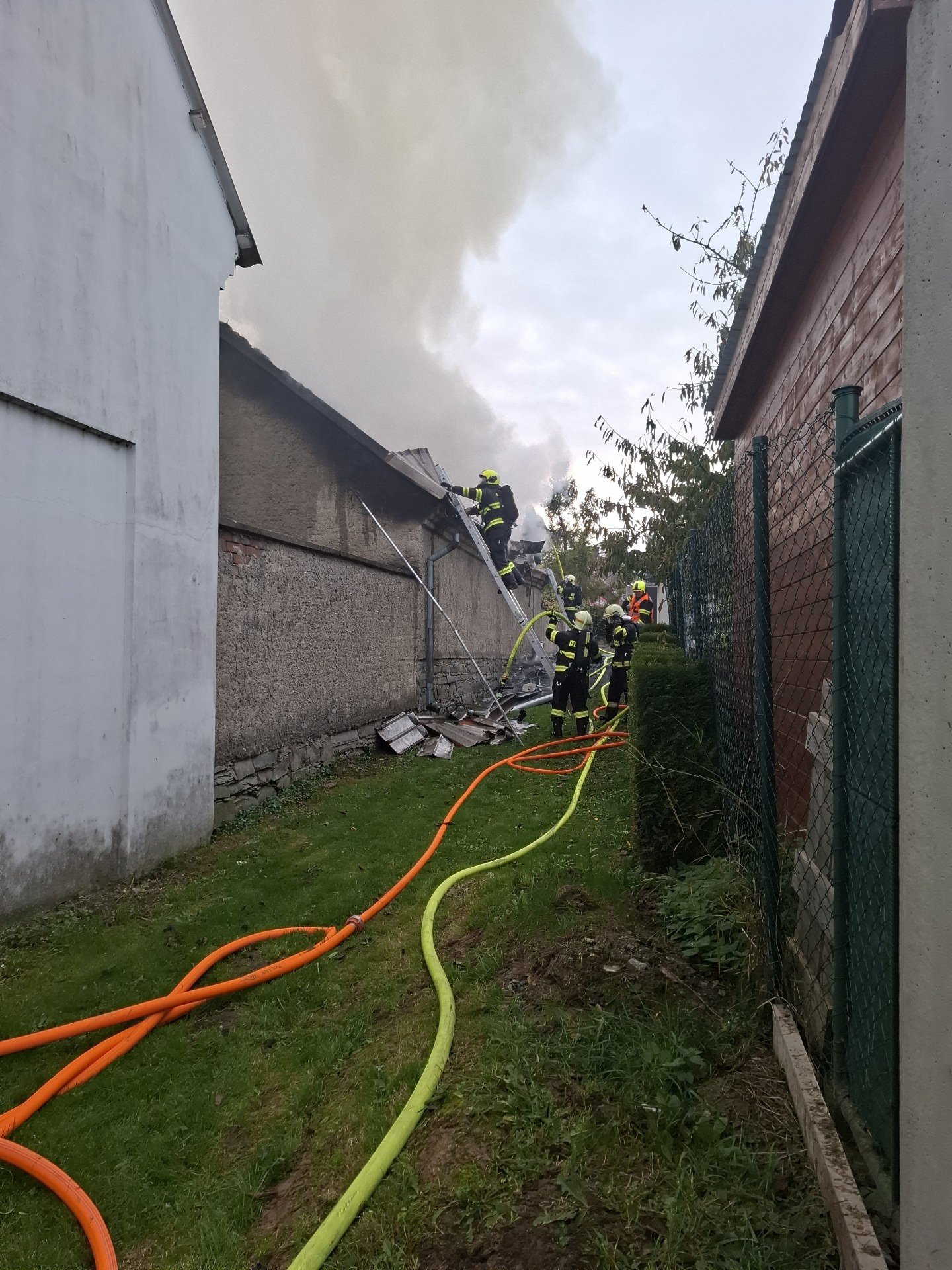 Jedním z proudů vody hasiči ochlazovali také sousední rodinný dům, který byl ohněm bezprostředně ohrožen. Vyšetřovatel hasičského záchranného sboru nyní zjišťuje příčinu vzniku požáru.