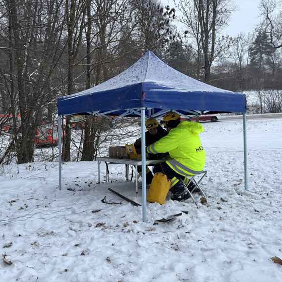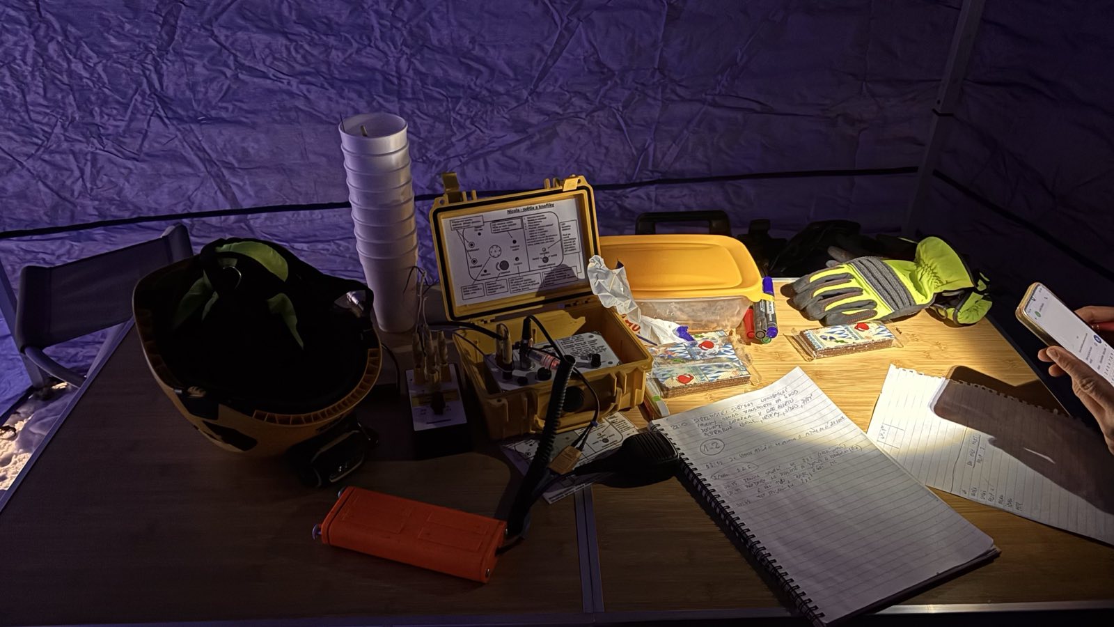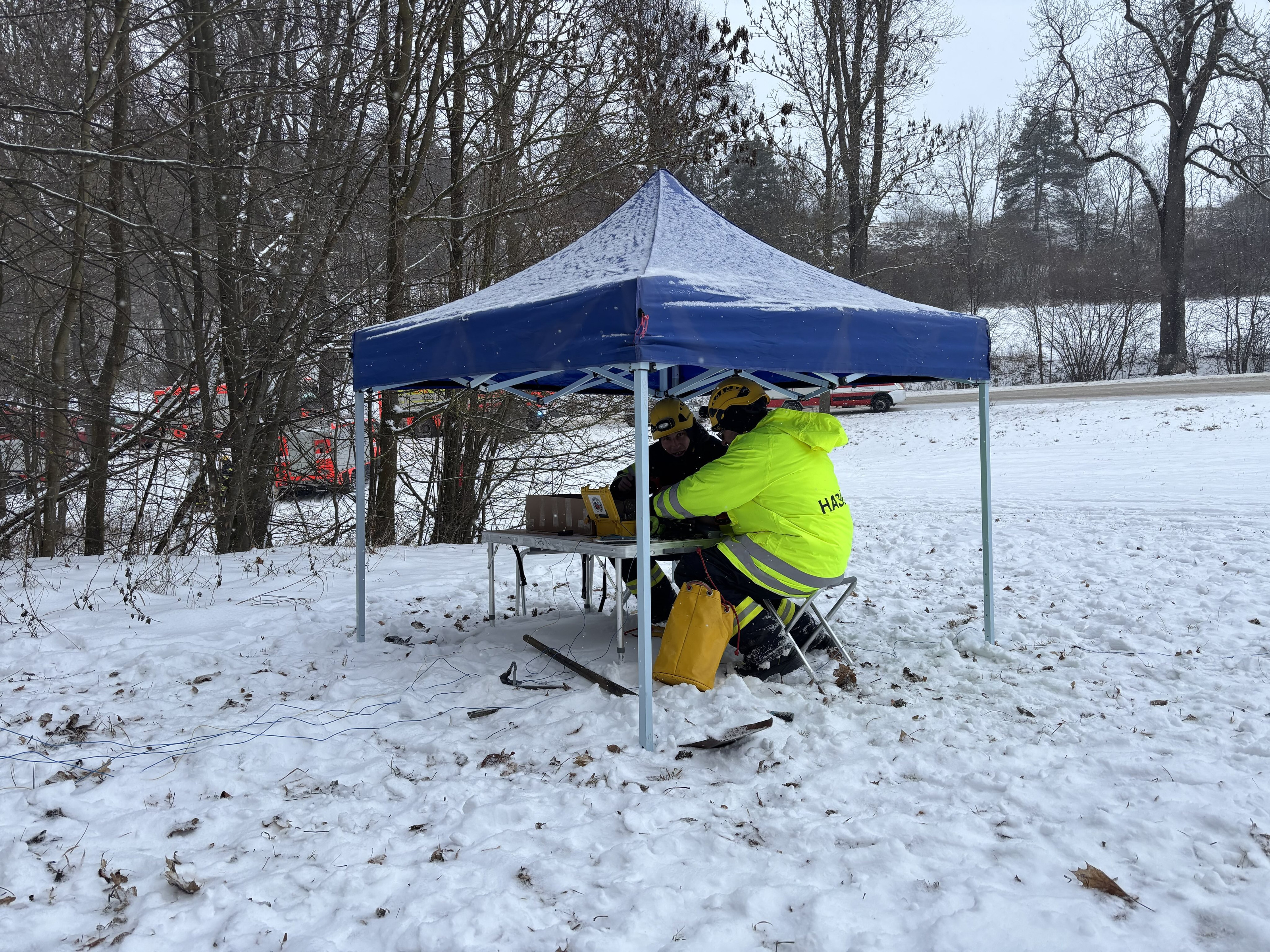 Rozvinuli jsme celou základnu. To znamená stan, kontaktní vysílačku Nikola, která je určena ke spojení s podzemím, a nachystali jsme jeskyňářům vše potřebné. Po několika minutách přijeli záchranáři – speleologové a profesionální hasiči-lezci z HZS Jihomoravského kraje a dali se do práce. Nato přijely jednotky požární ochrany obcí Olomučany, Bořitov a Lysice, předurčené k ochraně obyvatelstva. Ty přichystaly další nafukovací stany, aby se záchranáři měli kde ohřát, dát si v jejich péči občerstvení a odpočinout.