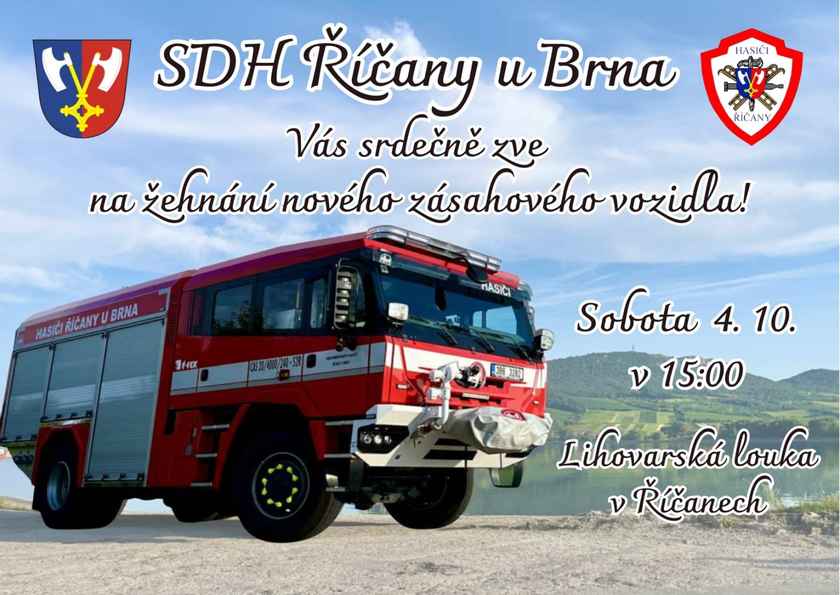 Říčanští hasiči si Vás dovolují pozvat na slavnostní předání a křest nového zásahového vozidla pro výjezdovou jednotku, které se uskuteční v sobotu dne 4. října 2025 v