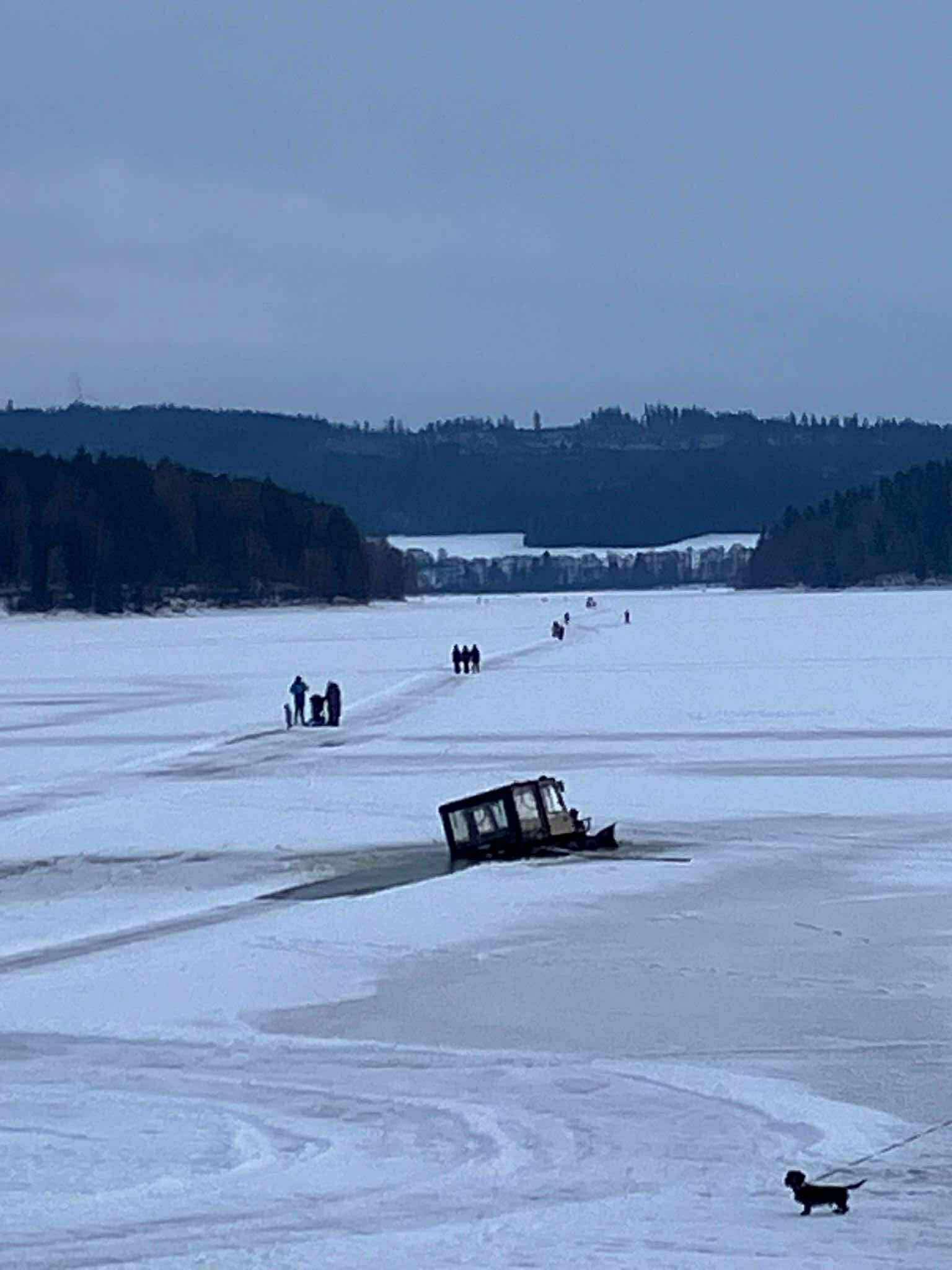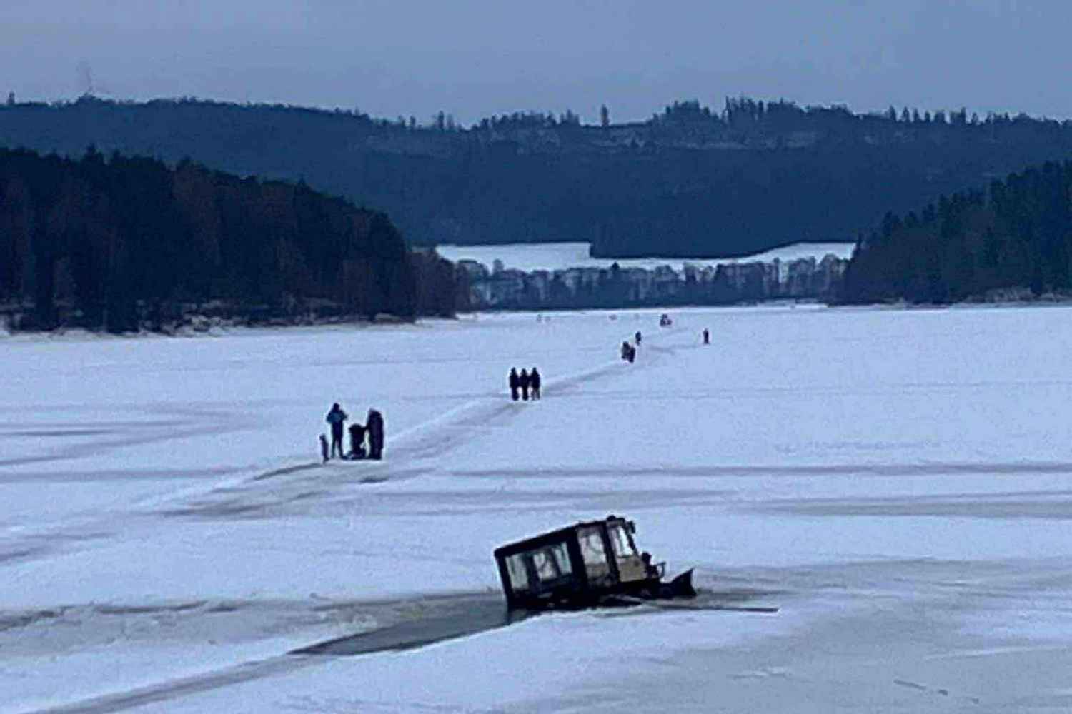 VIDEO: Čtyři metry pod hladinou. Na Lipně se u Frymburku propadla osmikolka při úpravě ledu