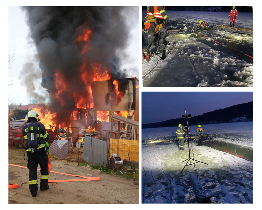 Jednotky profesionálních i dobrovolných hasičů řešily dvě události v krátkém čase. Ve Frymburku pomáhaly s vytažením rolby, která se propadla pod led, v Českých Budějovicích likvidovaly požár chaty hořící v plném rozsahu.