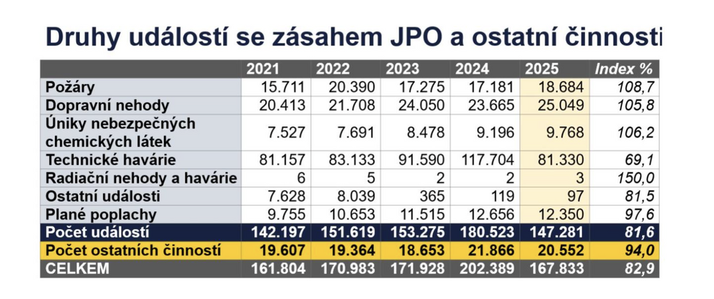 V oblasti požárů byl v roce 2025 evidován zvýšený počet zejména u požárů lesních porostů, volných a skladovacích ploch a u požárů odpadů a skládek. Meziročně vzrostly také přímé škody způsobené požáry, a to i v důsledku několika mimořádně rozsáhlých průmyslových požárů.
