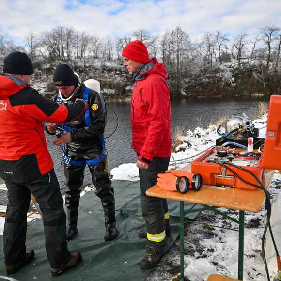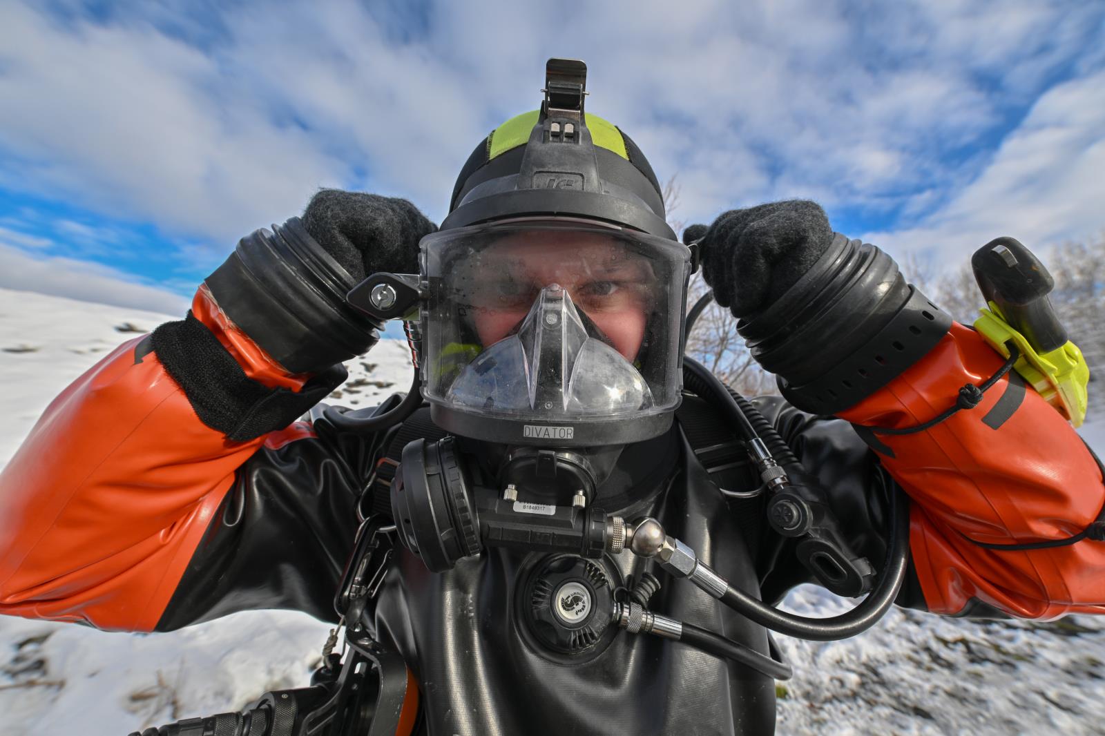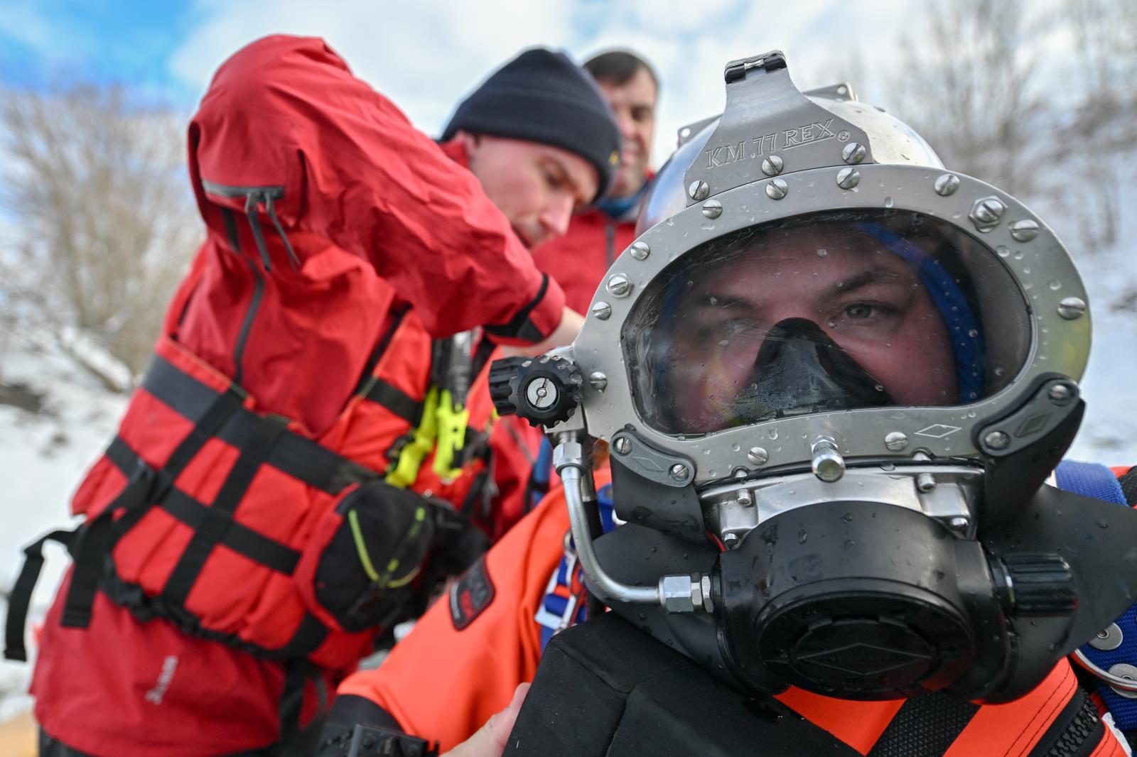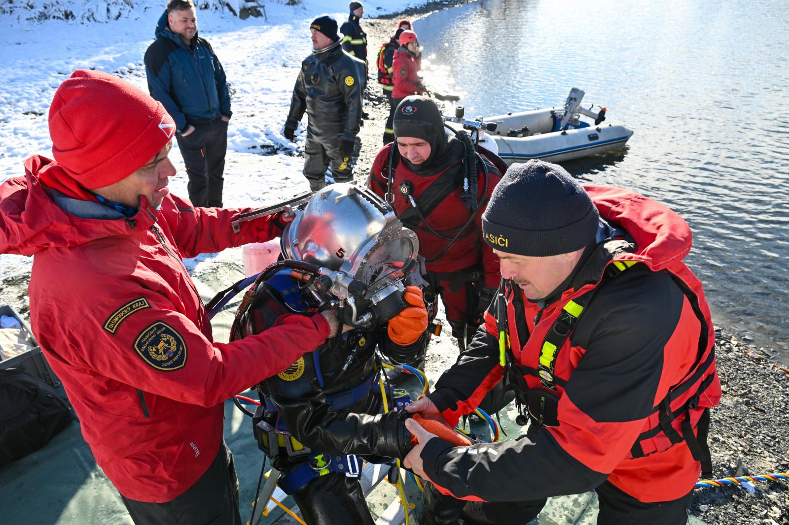 Potápěči hasičů testovali při cvičení v ledovém lomu Šifr přilbu Kirby Morgan v extrémních podmínkách.