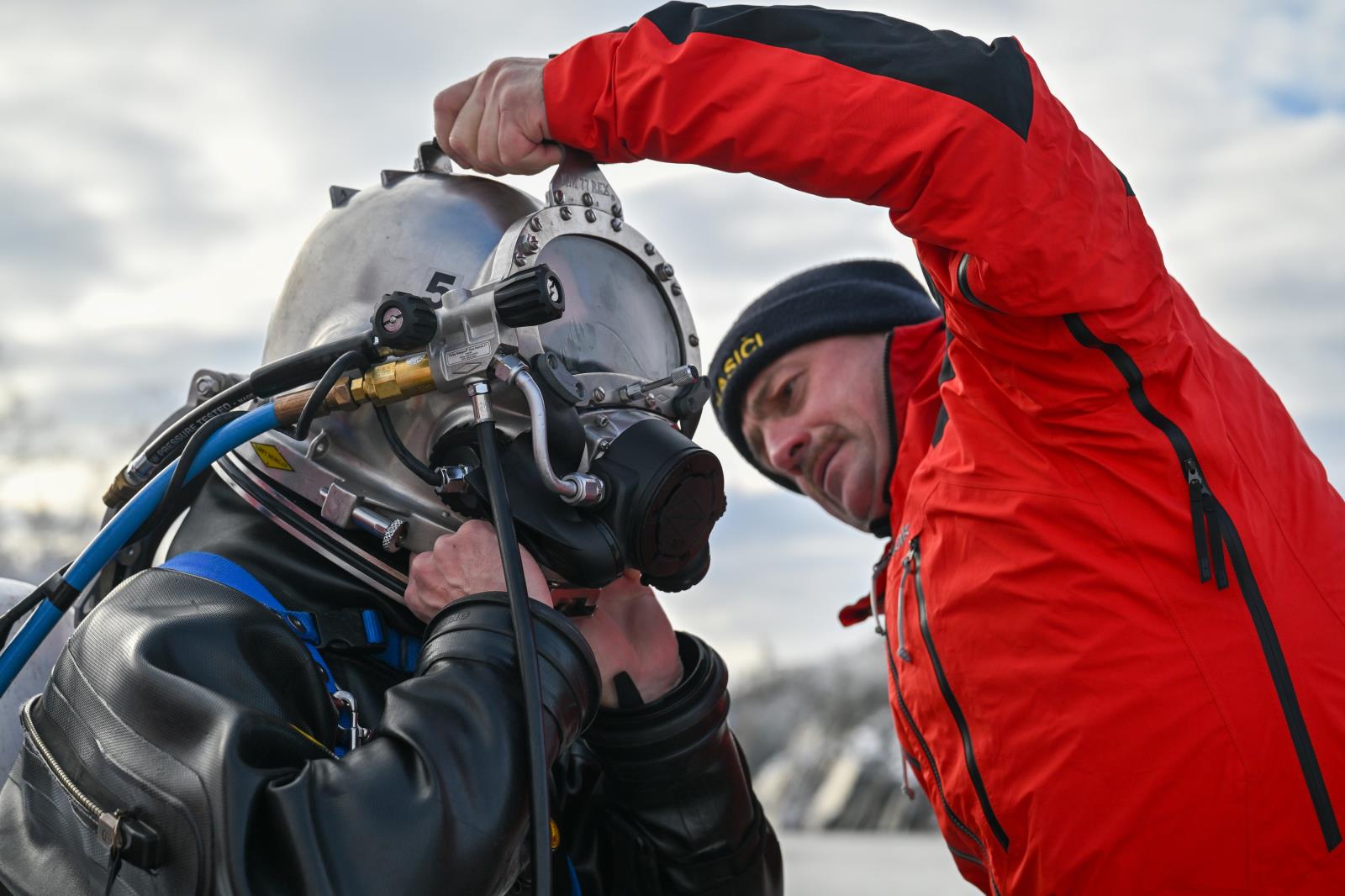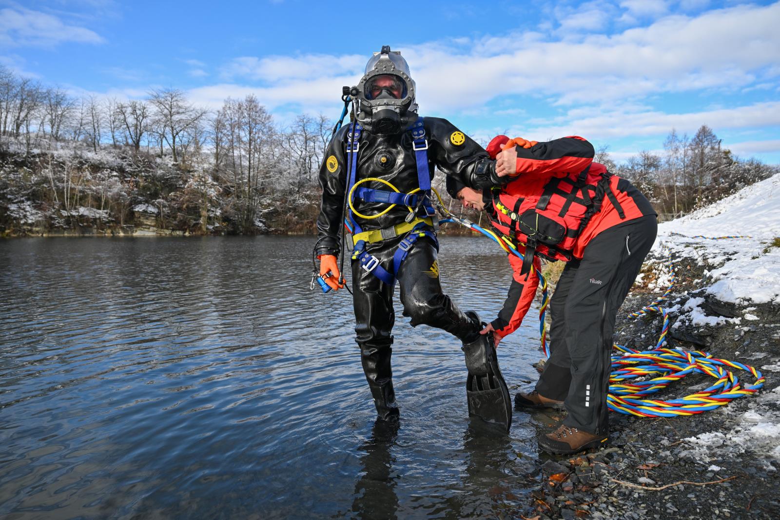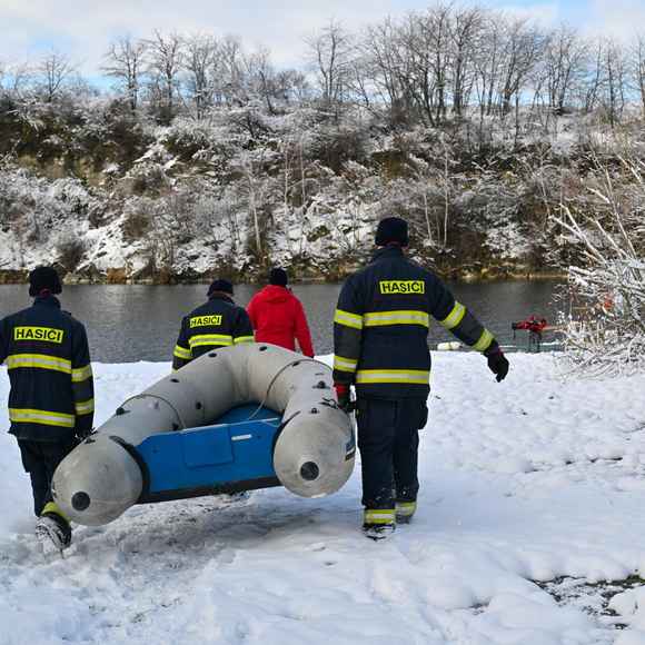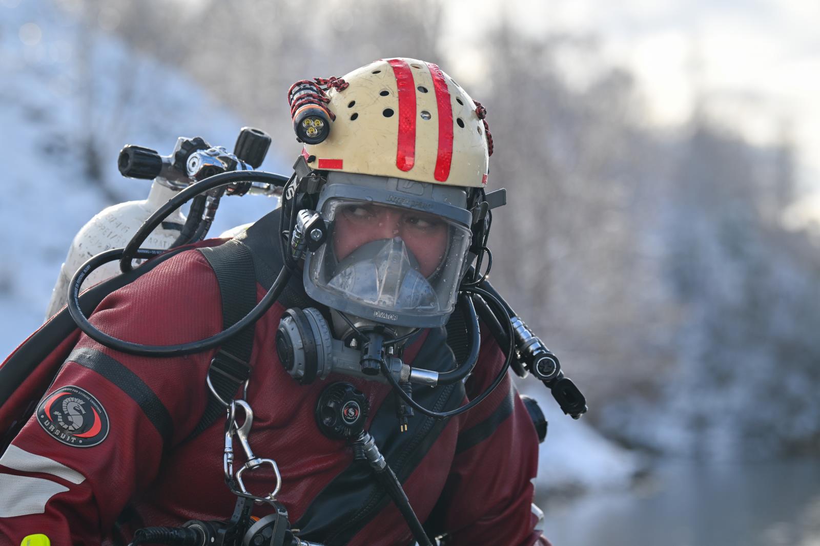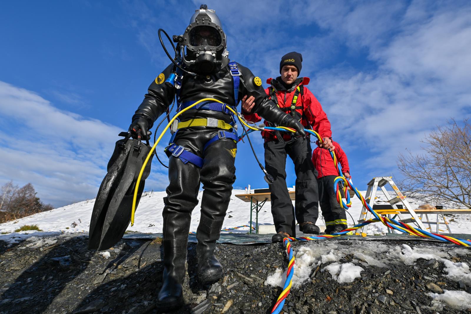Potápěči hasičů testovali při cvičení v ledovém lomu Šifr přilbu Kirby Morgan v extrémních podmínkách.