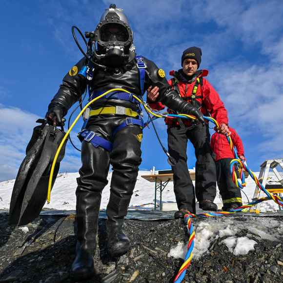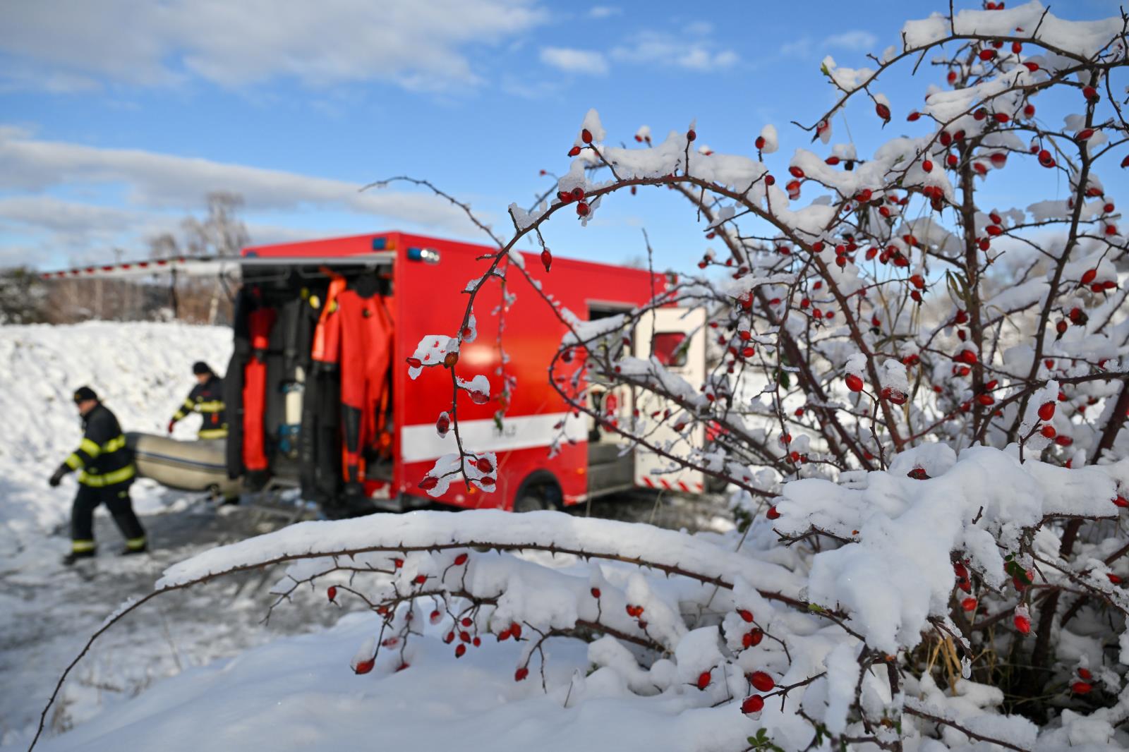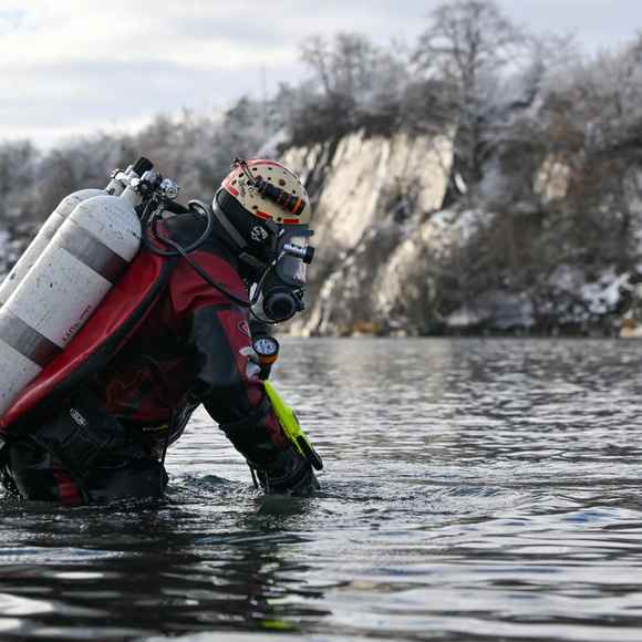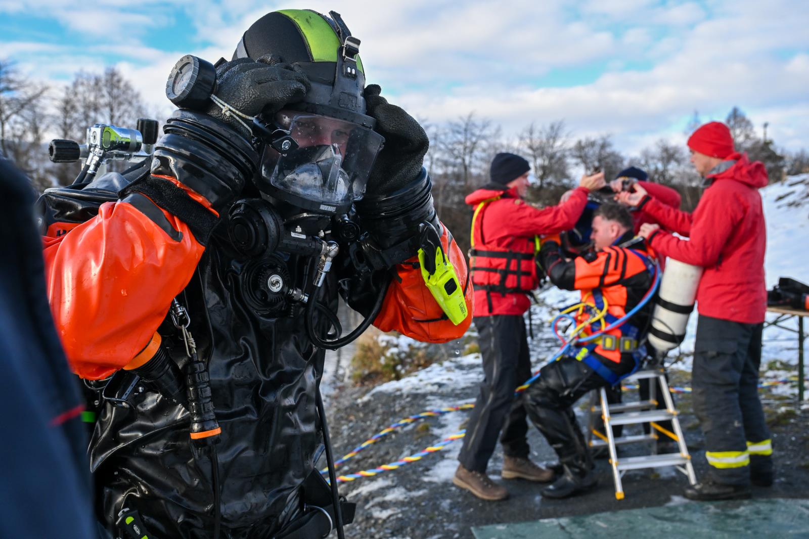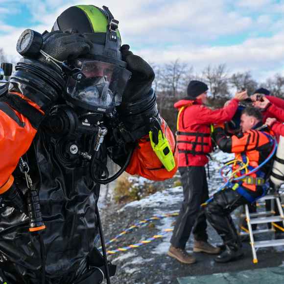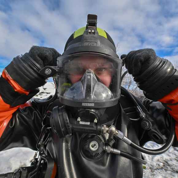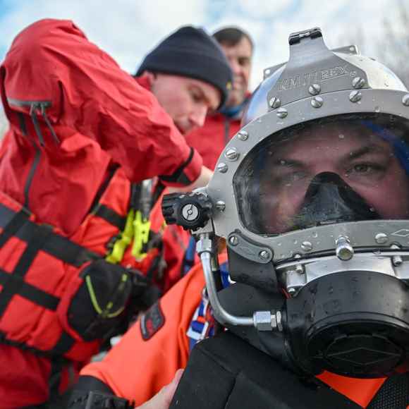 Potápěči hasičů testovali při cvičení v ledovém lomu Šifr přilbu Kirby Morgan v extrémních podmínkách.