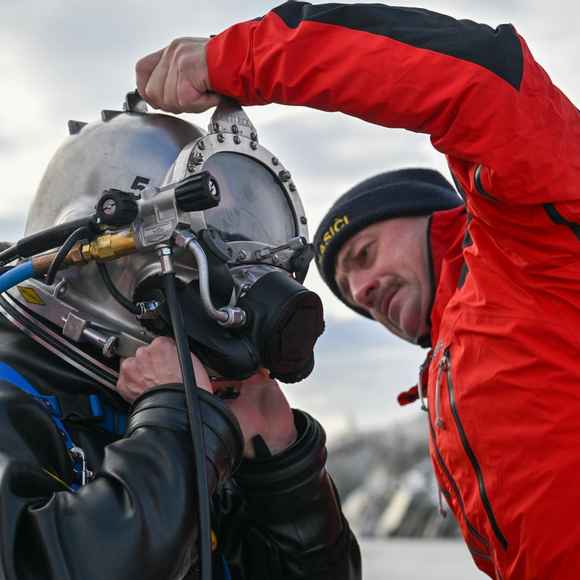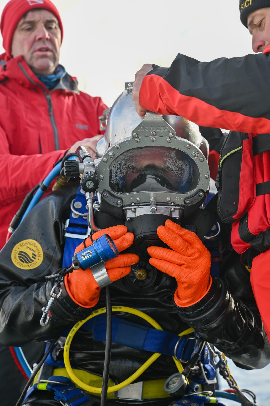 "Během výcviku jsme provedli tři sestupy v pětičlenných skupinách. Každou skupinu tvořil potápěč s přilbou Kirby Morgan, která váží téměř patnáct kilogramů, jistící potápěč, který jde pod hladinu souběžně. '